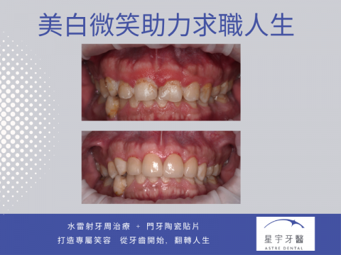 案例分享 這位患者在職場上,遇到了瓶頸,想轉換工作職場,面試卻屢屢碰壁。 因此他決定從「型」開始,打理自身形象,也為了讓笑容更加自信從容,解決自己長年牙周發炎,門牙顏色不均還有蛀牙等問題。 經過我們的邵...