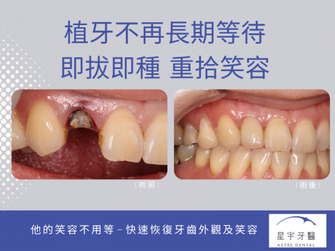 他的笑容不用等-植牙即拔即種案例分享 患者因為一顆前牙嚴重蛀牙,牙齒崩落且影響咬合及美觀而來到診所。 這種蛀牙已嚴重至深入牙根,需要拔牙後進行植牙手術,才能回復原本的功能。 傳統的刻板印象認為植牙需經歷...