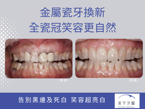 告別黑邊及死白 笑容超亮白 金屬瓷牙是早期相當普遍的修復選項,內層是金屬結構作為支撐,外面再烤瓷。 這位患者早期便是使用金屬瓷牙,然而隨著時間推移,卻出現了幾個困擾: 顏色死白、不自然,與鄰牙顏色落差明顯...